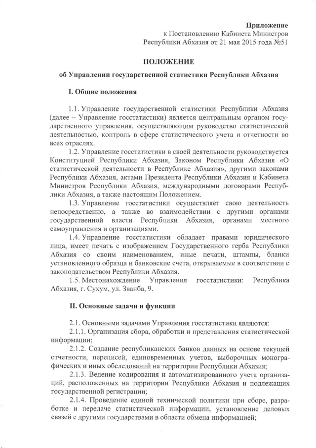 Постановление Кабинета Министров Республики Абхазия от 21.05.2015 № 51 "Об утверждении "Положения об Управлении государственной статистики Республики Абхазия"