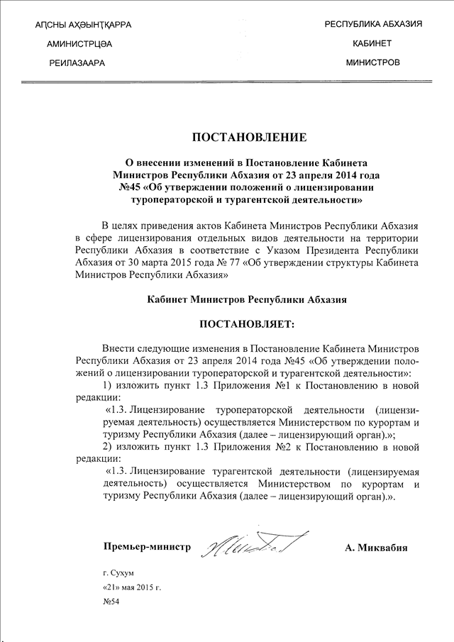 Постановление Кабинета Министров Республики Абхазия от 21.05.2015 № 54 "О внесении изменений в Постановление Кабинета Министров Республики Абхазия от 23 апреля 2014 года № 45 "Об утверждении положений о лицензировании туроператорской и турагентской деятельности"