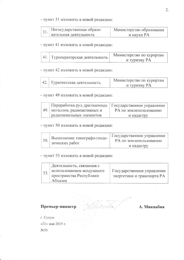 Постановление Кабинета Министров Республики Абхазия от 21.05.2015 № 55 "О внесении изменений в Постановление Кабинета Министров Республики Абхазия от 7 марта 2012 года № 33 "О лицензировании отдельных видов деятельности на территории Республики Абхазия"