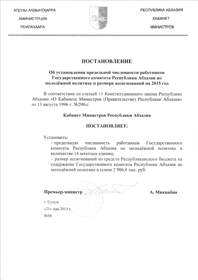 Постановление Кабинета Министров Республики Абхазия от 21.05.2015 № 56 "Об установлении предельной численности работников Государственного комитета Республики Абхазия по молодёжной политике и размера ассигнований на 2015 год"