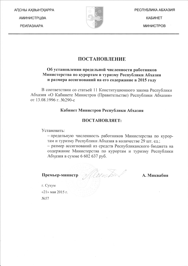 Постановление Кабинета Министров Республики Абхазия от 21.05.2015 № 57 "Об установлении предельной численности работников Министерства по курортам и туризму Республики Абхазия и размера ассигнований на его содержание в 2015 году"