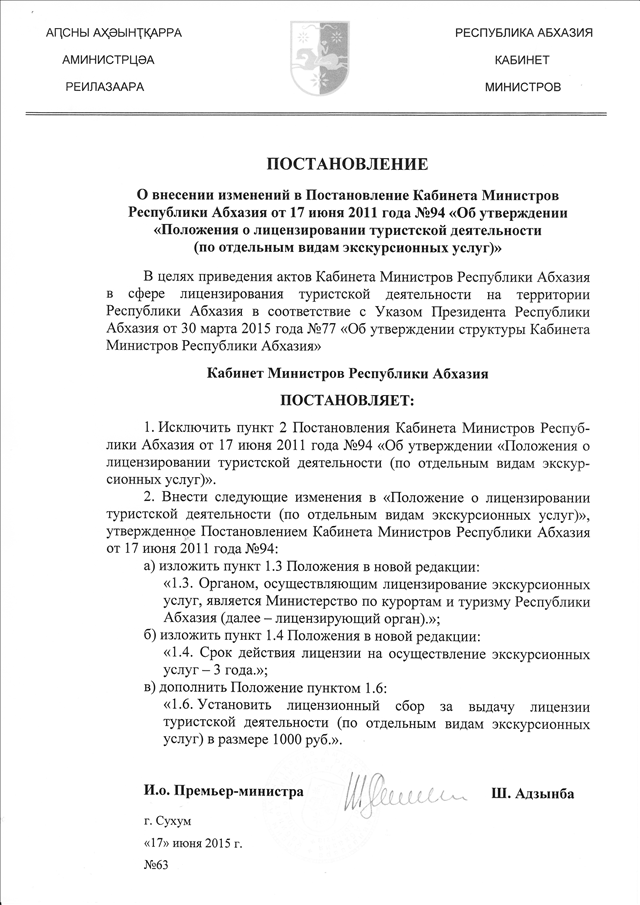 Постановление Кабинета Министров Республики Абхазия от 17.06.2015 № 63 "О внесении изменений в Постановление Кабинета Министров Республики Абхазия от 17 июня 2011 года № 94 "Об утверждении "Положения о лицензировании туристской деятельности (по отдельным видам экскурсионных услуг)"
