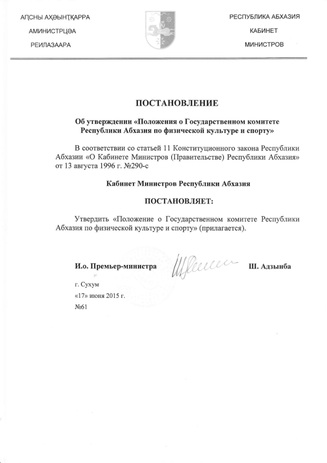 Постановление Кабинета Министров Республики Абхазия от 17.06.2015 № 61 "Об утверждении "Положения о Государственном комитете Республики Абхазия по физической культуре и спорту"