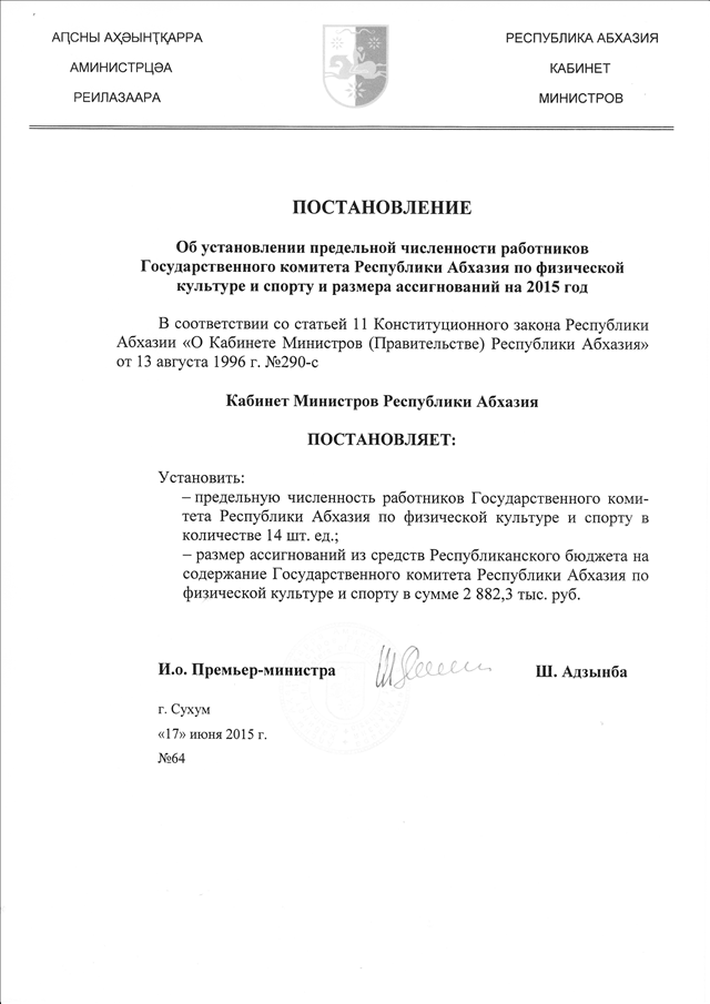 Постановление Кабинета Министров Республики Абхазия от 17.06.2015 № 64 "Об установлении предельной численности работников Государственного комитета Республики Абхазия по физической культуре и спорту и размера ассигнований на 2015 год"