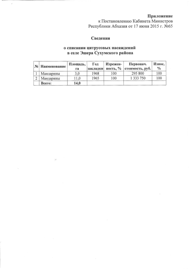 Постановление Кабинета Министров Республики Абхазия от 17.06.2015 № 65 "О списании цитрусовых насаждений в селе Эшера Сухумского района"