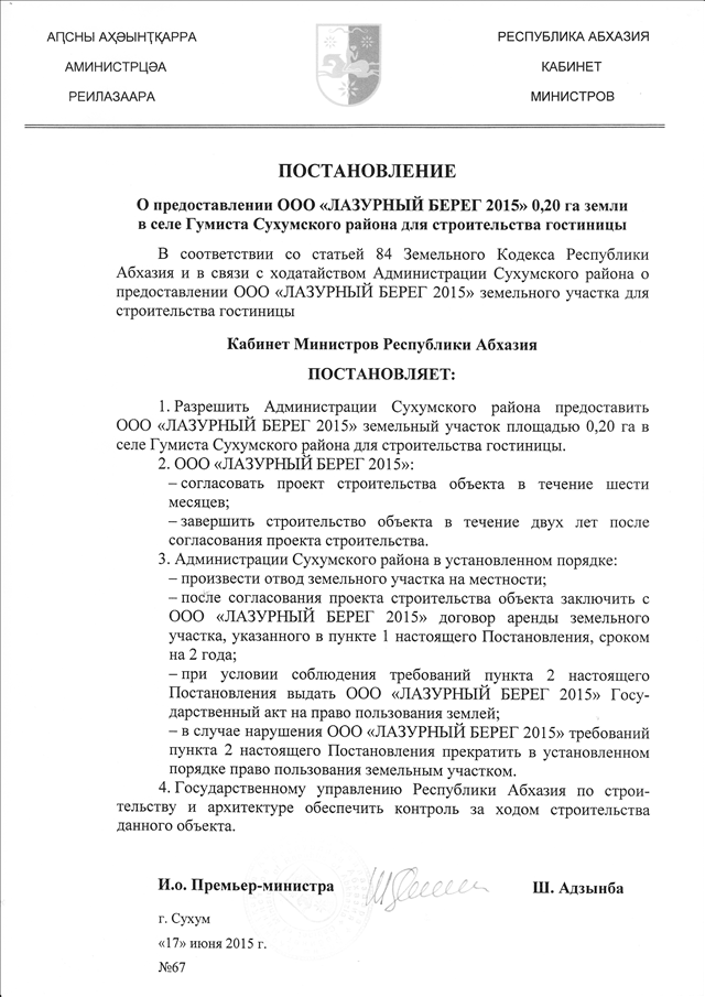 Постановление Кабинета Министров Республики Абхазия от 17.06.2015 № 67 "О предоставлении ООО "ЛАЗУРНЫЙ БЕРЕГ 2015" 0,20 га земли в селе Гумиста Сухумского района для строительства гостиницы"