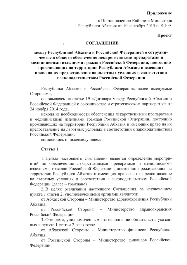 Постановление Кабинета Министров Республики Абхазия от 10.09.2015 № 109 "О проекте Соглашения между Республикой Абхазия и Российской Федерацией о сотрудничестве в области обеспечения лекарственными препаратами и медицинскими изделиями граждан Российской Федерации, постоянно проживающих на территории Республики Абхазия и имеющих право на их предоставление на льготных условиях в соответствии с законодательством Российской Федерации"