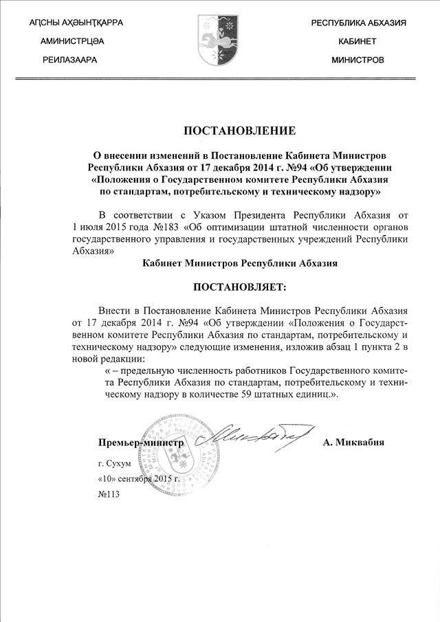 Постановление Кабинета Министров Республики Абхазия от 10.09.2015 № 113 "О внесении изменений в Постановление Кабинета Министров Республики Абхазия от 17 декабря 2014 г. № 94 "Об утверждении "Положения о Государственном комитете Республики Абхазия по стандартам, потребительскому и техническому надзору"
