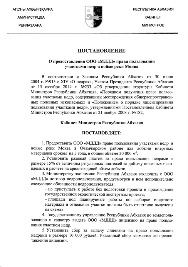 Постановление Кабинета Министров Республики Абхазия от 10.09.2015 № 114 "О предоставлении ООО "МДДД" права пользования участками недр в пойме реки Моква"