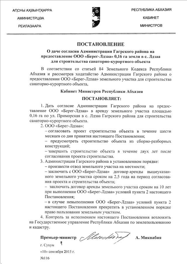 Постановление Кабинета Министров Республики Абхазия от 10.09.2015 № 116 "О даче согласия Администрации Гагрского района на предоставление ООО "Берег-Лдзаа" 0,16 га земли в с. Лдзаа для строительства санаторно-курортного объекта"
