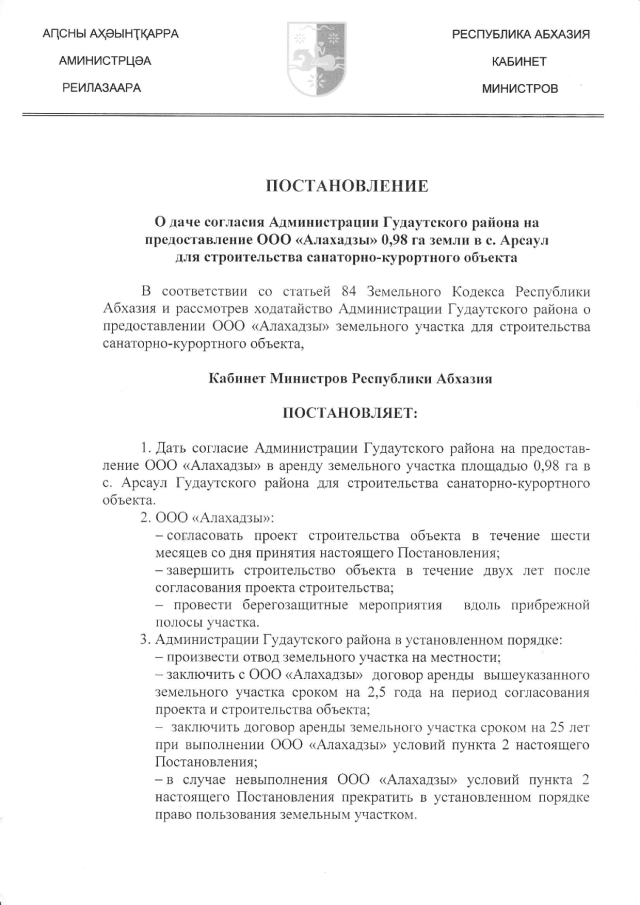 Постановление Кабинета Министров Республики Абхазия от 10.09.2015 № 117 "О даче согласия Администрации Гудаутского района на предоставление ООО "Алахадзы" 0,98 га земли в с. Арсаул для строительства санаторно-курортного объекта"