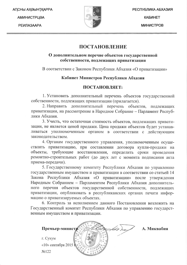 Постановление Кабинета Министров Республики Абхазия от 10.09.2015 № 122 "О дополнительном перечне объектов государственной собственности, подлежащих приватизации"