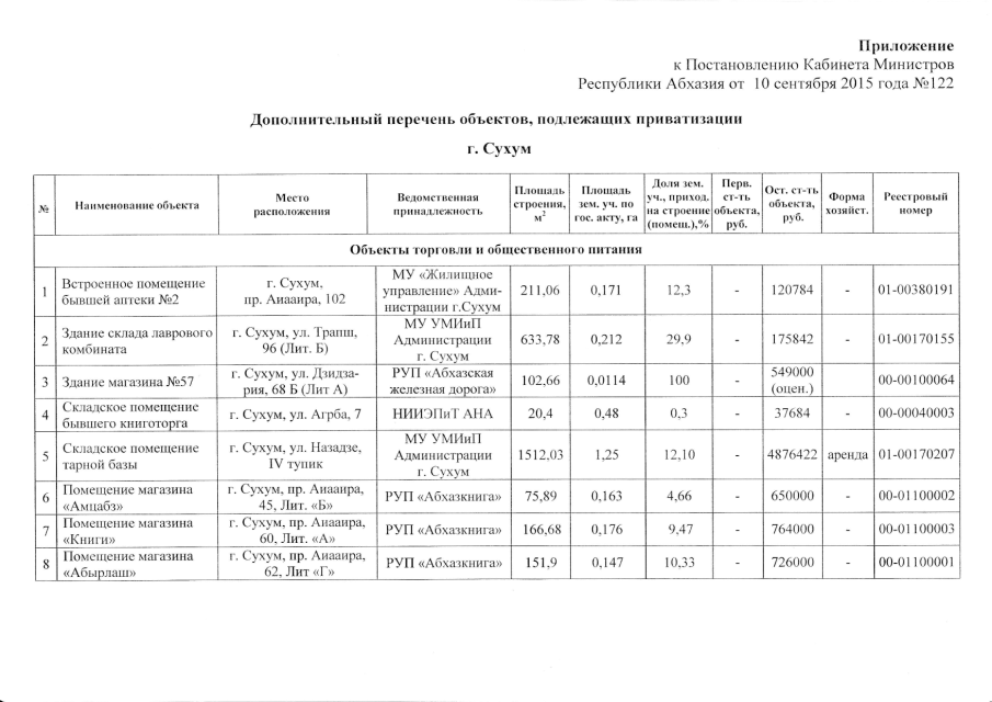 Постановление Кабинета Министров Республики Абхазия от 10.09.2015 № 122 "О дополнительном перечне объектов государственной собственности, подлежащих приватизации"