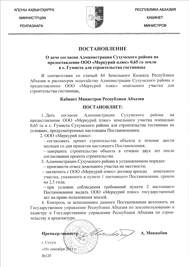 Постановление Кабинета Министров Республики Абхазия от 10.09.2015 № 120 "О даче согласия Администрации Сухумского района на предоставление ООО "Меркурий плюс" 0,65 га земли в с. Гумиста для строительства гостиницы"