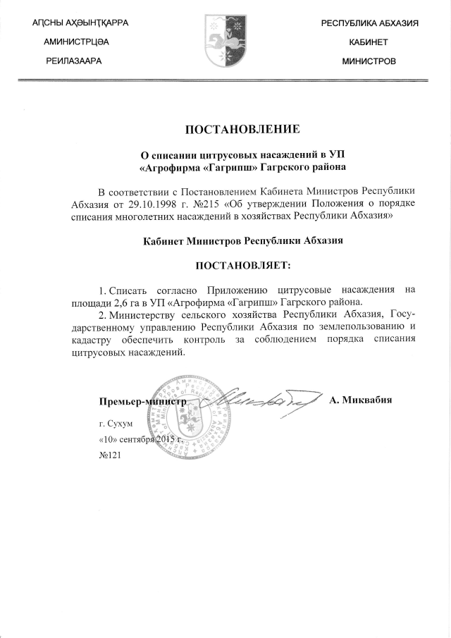 Постановление Кабинета Министров Республики Абхазия от 10.09.2015 № 121 "О списании цитрусовых насаждений в УП "Агрофирма <Гагрипш" Гагрского района"