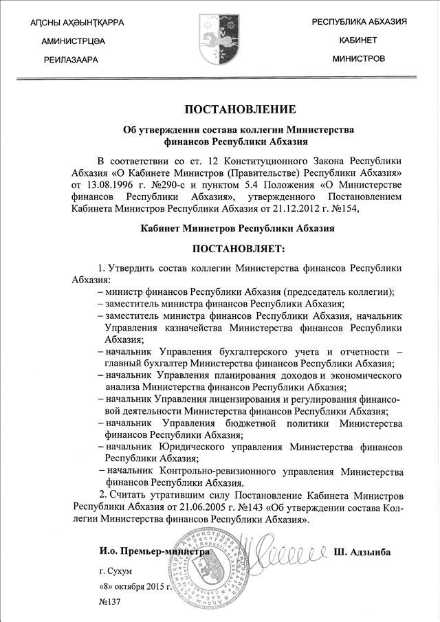 Постановление Кабинета Министров Республики Абхазия от 08.10.2015 № 137 "Об утверждении состава коллегии Министерства финансов Республики Абхазия"