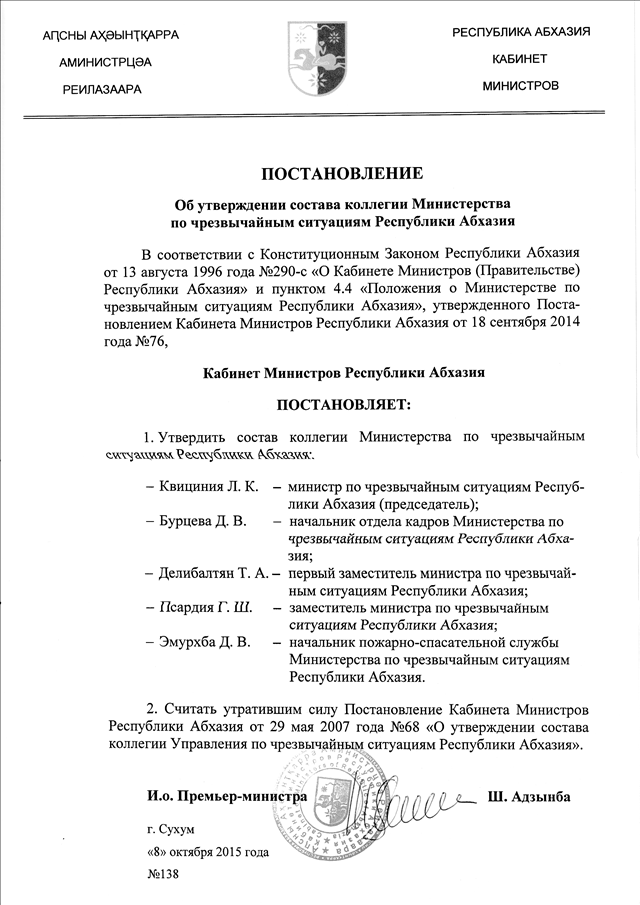 Постановление Кабинета Министров Республики Абхазия от 08.10.2015 № 138 "Об утверждении состава коллегии Министерства по чрезвычайным ситуациям Республики Абхазия"