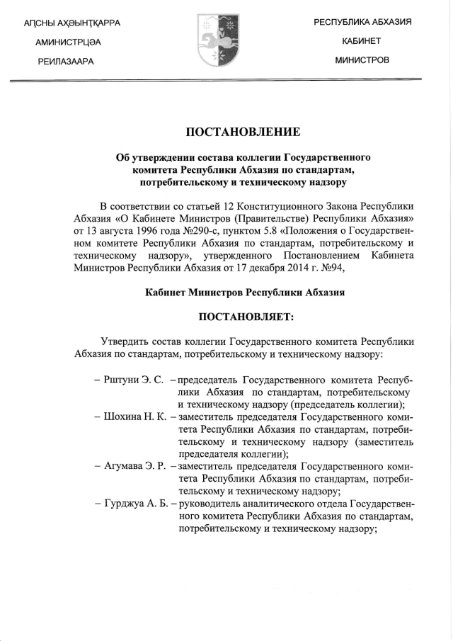 Постановление Кабинета Министров Республики Абхазия от 08.10.2015 № 139 "Об утверждении состава коллегии Государственного комитета Республики Абхазия по стандартам, потребительскому и техническому надзору"