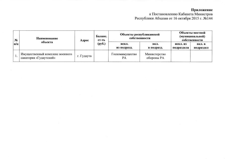 Постановление Кабинета Министров Республики Абхазия от 16.10.2015 № 144 "О внесении изменения в Постановление Кабинета Министров Республики Абхазия от 06.06.2002 года № 117 "О порядке оформления разграничения государственной собственности и формирования Реестра собственности"