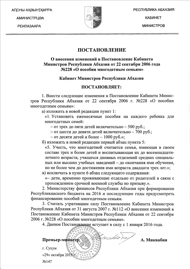Постановление Кабинета Министров Республики Абхазия от 29.10.2015 № 147 "О внесении изменений в Постановление Кабинета Министров Республики Абхазия от 22 сентября 2006 года № 228 "О пособии многодетным семьям"