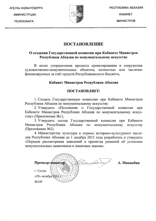 Постановление Кабинета Министров Республики Абхазия от 29.10.2015 № 149 "О создании Государственной комиссии при Кабинете Министров Республики Абхазия по монументальному искусству"