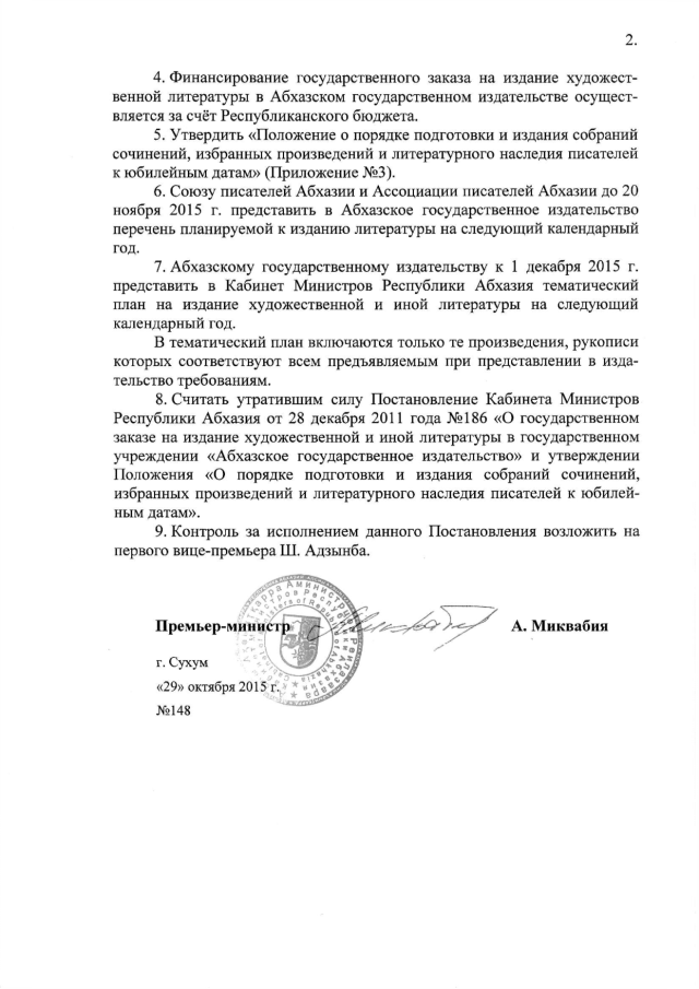 Постановление Кабинета Министров Республики Абхазия от 29.10.2015 № 148 "О государственном заказе на издание художественной и иной литературы в Республиканском государственном учреждении "Абхазское государственное издательство" и утверждении "Положения о порядке подготовки и издания собраний сочинений, избранных произведений и литературного наследия писателей к юбилейным датам" на 2016 год"
