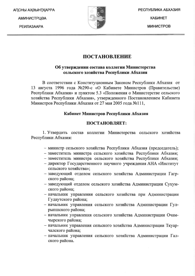 Постановление Кабинета Министров Республики Абхазия от 29.10.2015 № 150 "Об утверждении состава коллегии Министерства сельского хозяйства Республики Абхазия"