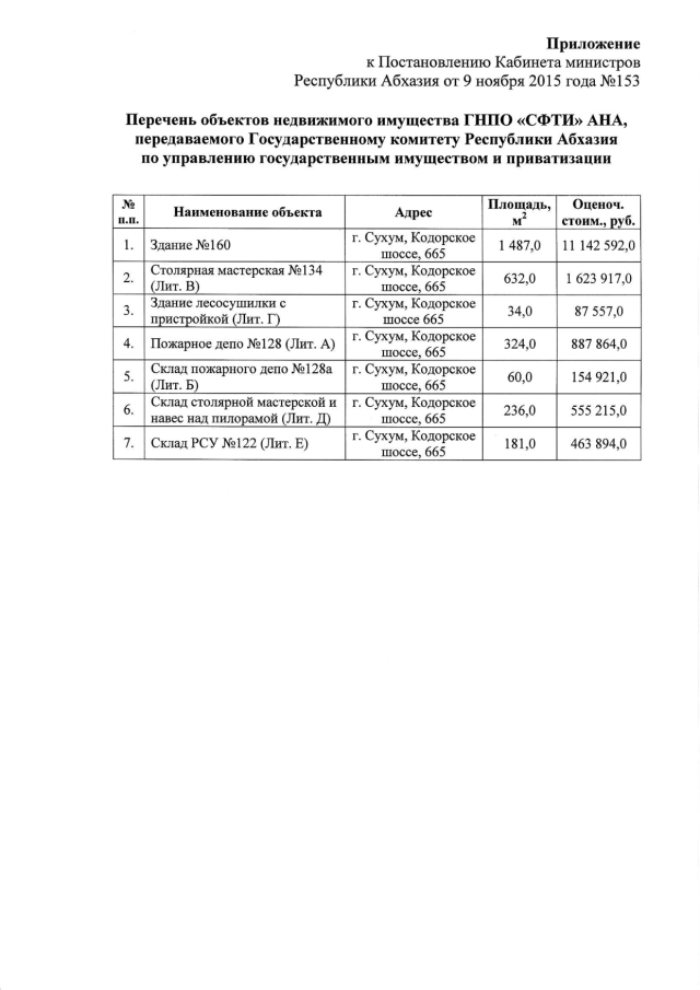 Постановление Кабинета Министров Республики Абхазия от 09.11.2015 № 153 "Об имущественном комплексе ТкуарчалГРЭС и части имущественного комплекса Государственного научно-производственного объединения (ГНПО) "СФТИ" Академии наук Абхазии"
