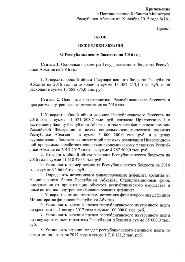 Постановление Кабинета Министров Республики Абхазия от 19.11.2015 № 161 "О проекте Закона Республики Абхазия "О Республиканском бюджете на 2016 год"
