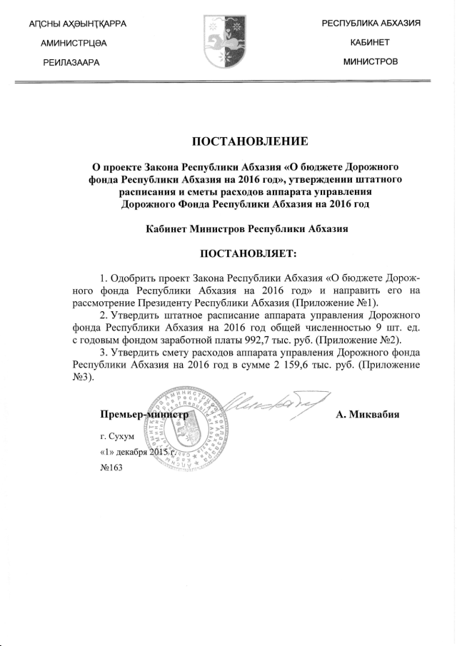 Постановление Кабинета Министров Республики Абхазия от 01.12.2015 № 163 "О проекте Закона Республики Абхазия "О бюджете Дорожного фонда Республики Абхазия на 2016 год", утверждении штатного расписания и сметы расходов аппарата управления Дорожного Фонда Республики Абхазия на 2016 год"