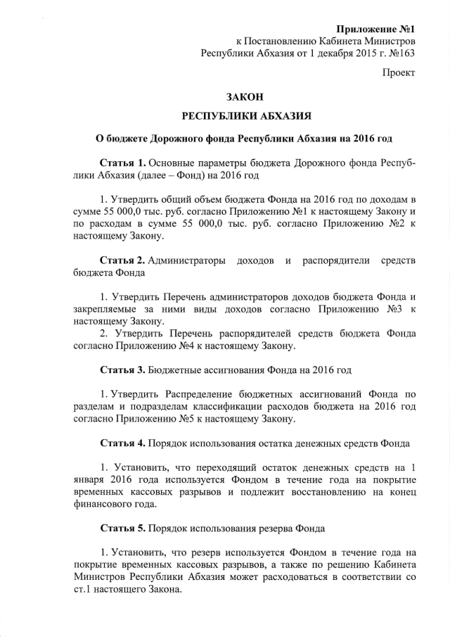Постановление Кабинета Министров Республики Абхазия от 01.12.2015 № 163 "О проекте Закона Республики Абхазия "О бюджете Дорожного фонда Республики Абхазия на 2016 год", утверждении штатного расписания и сметы расходов аппарата управления Дорожного Фонда Республики Абхазия на 2016 год"