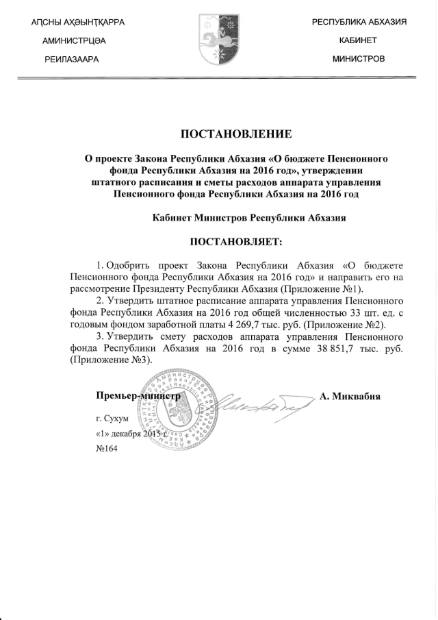 Постановление Кабинета Министров Республики Абхазия от 01.12.2015 № 164 "О проекте Закона Республики Абхазия "О бюджете Пенсионного фонда Республики Абхазия на 2016 год", утверждении штатного расписания и сметы расходов аппарата управления Пенсионного фонда Республики Абхазия на 2016 год"