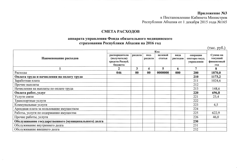 Постановление Кабинета Министров Республики Абхазия от 01.12.2015 № 165 "О проекте Закона Республики Абхазия "О бюджете Фонда обязательного медицинского страхования Республики Абхазия на 2016 год", утверждении штатного расписания и сметы расходов аппарата управления Фонда обязательного медицинского страхования Республики Абхазия на 2016 год"