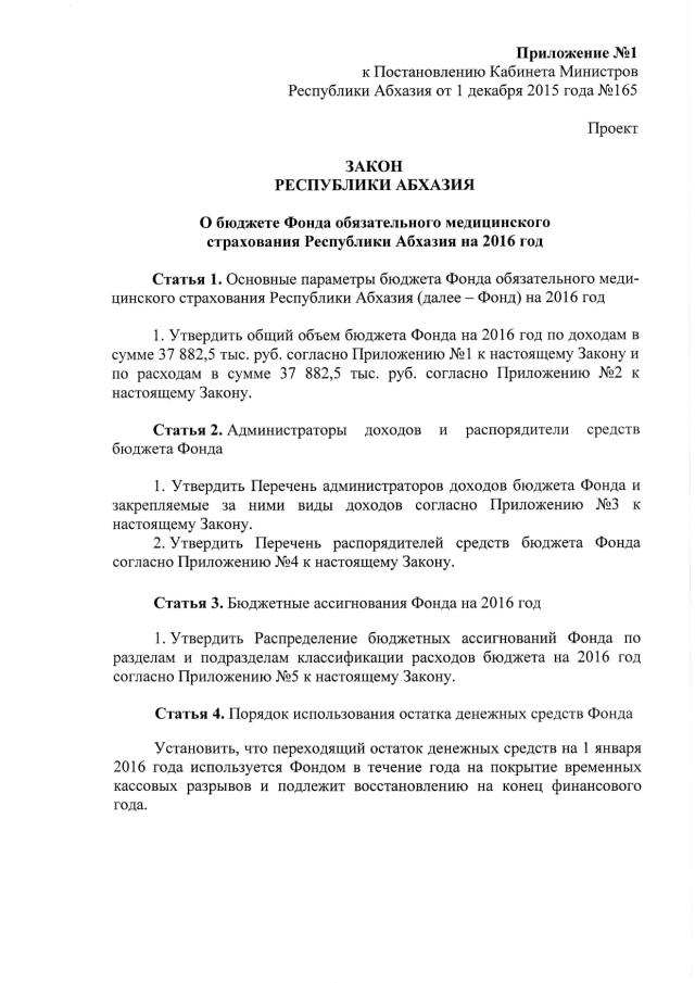 Постановление Кабинета Министров Республики Абхазия от 01.12.2015 № 165 "О проекте Закона Республики Абхазия "О бюджете Фонда обязательного медицинского страхования Республики Абхазия на 2016 год", утверждении штатного расписания и сметы расходов аппарата управления Фонда обязательного медицинского страхования Республики Абхазия на 2016 год"