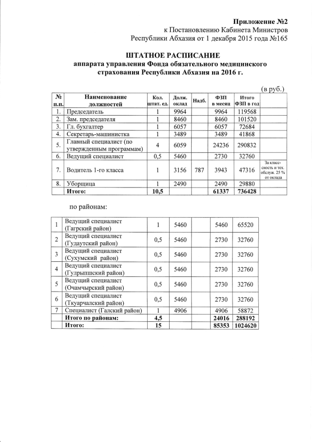 Постановление Кабинета Министров Республики Абхазия от 01.12.2015 № 165 "О проекте Закона Республики Абхазия "О бюджете Фонда обязательного медицинского страхования Республики Абхазия на 2016 год", утверждении штатного расписания и сметы расходов аппарата управления Фонда обязательного медицинского страхования Республики Абхазия на 2016 год"