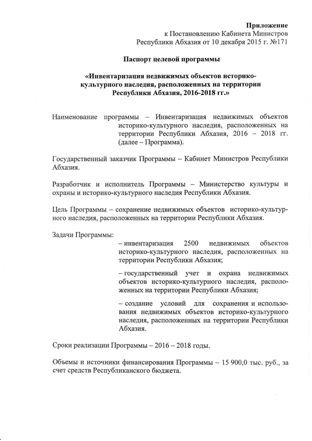 Постановление Кабинета Министров Республики Абхазия от 10.12.2015 № 171 "Об утверждении целевой программы "Инвентаризация недвижимых объектов историко-культурного наследия, расположенных на территории Республики Абхазия, 2016-2018 гг."
