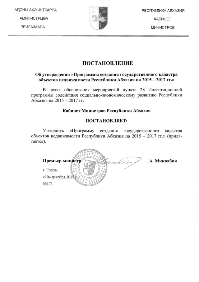 Постановление Кабинета Министров Республики Абхазия от 10.12.2015 № 173 "Об утверждении "Программы создания государственного кадастра объектов недвижимости Республики Абхазия на 2015-2017 гг."