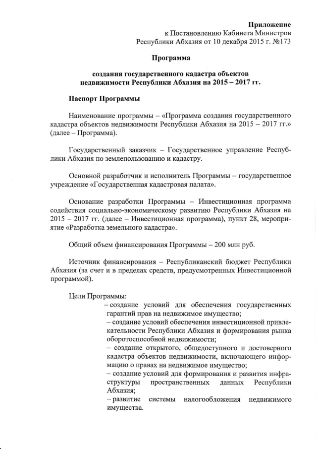 Постановление Кабинета Министров Республики Абхазия от 10.12.2015 № 173 "Об утверждении "Программы создания государственного кадастра объектов недвижимости Республики Абхазия на 2015-2017 гг."