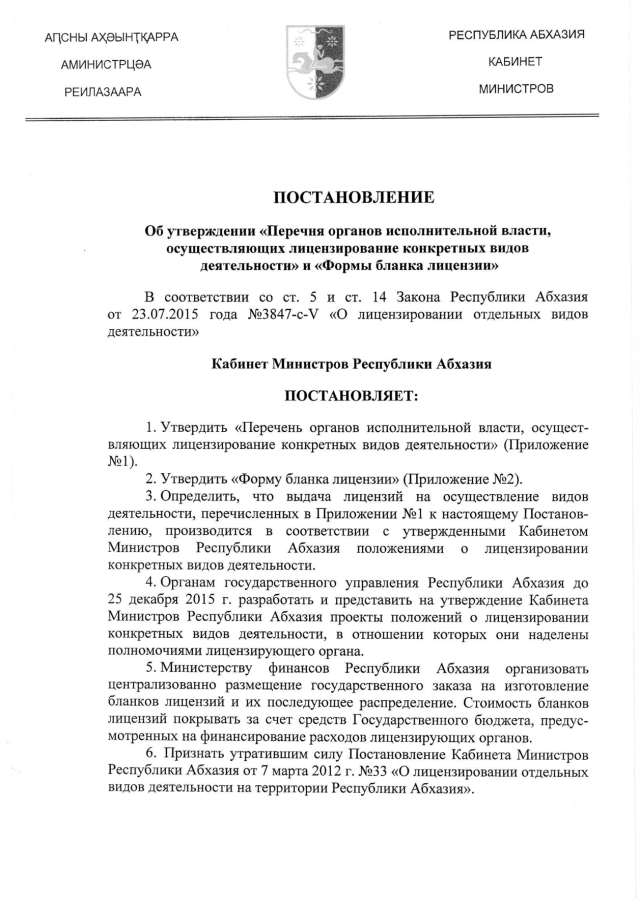 Постановление Кабинета Министров Республики Абхазия от 10.12.2015 № 174 "Об утверждении "Перечня органов исполнительной власти, осуществляющих лицензирование конкретных видов деятельности" и "Формы бланка лицензии"