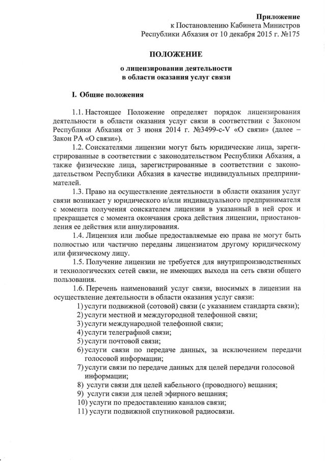 Постановление Кабинета Министров Республики Абхазия от 10.12.2015 № 175 "Об утверждении "Положения о лицензировании деятельности в области оказания услуг связи"