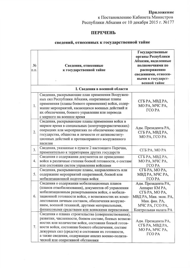 Постановление Кабинета Министров Республики Абхазия от 10.12.2015 № 177 "О "Перечне сведений, отнесенных к государственной тайне"