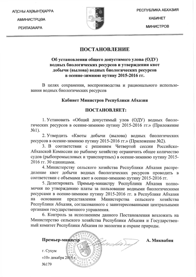 Постановление Кабинета Министров Республики Абхазия от 10.12.2015 № 179 "Об установлении общего допустимого улова (ОДУ) водных биологических ресурсов и утверждении квот добычи (вылова) водных биологических ресурсов в осенне-зимнюю путину 2015-2016 гг."