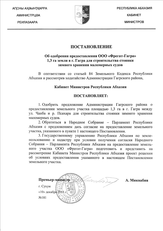 Постановление Кабинета Министров Республики Абхазия от 10.12.2015 № 181 "Об одобрении предоставления ООО "Фрегат-Гагра" 1,3 га земли в г. Гагра для строительства стоянки зимнего хранения маломерных судов"