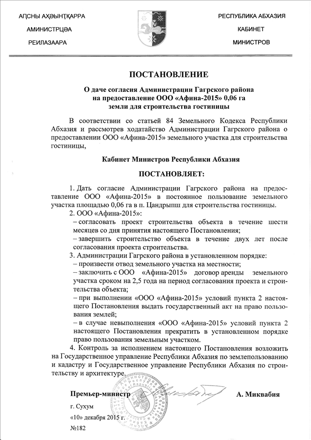 Постановление Кабинета Министров Республики Абхазия от 10.12.2015 № 182 "О даче согласия Администрации Гагрского района на предоставление ООО "Афина-2015" 0,06 га земли для строительства гостиницы"