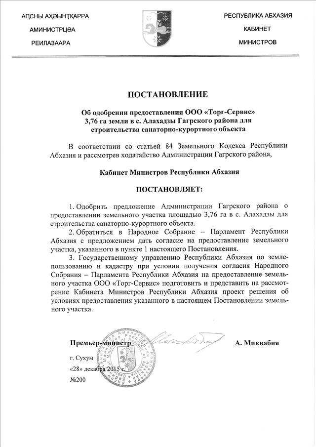 Постановление Кабинета Министров Республики Абхазия от 28.12.2015 № 200 "Об одобрении предоставления ООО "Торг-Сервис" 3,76 га земли в с. Алахадзы Гагрского района для строительства санаторно-курортного объекта"