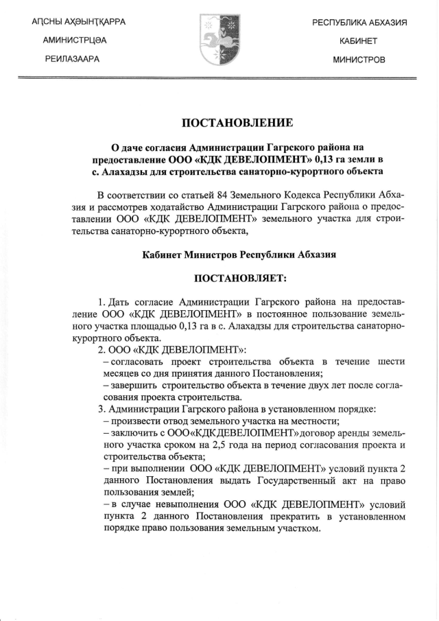 Постановление Кабинета Министров Республики Абхазия от 06.05.2016 № 82 "О даче согласия Администрации Гагрского района на предоставление ООО "КДК ДЕВЕЛОПМЕНТ"> 0,13 га земли в с. Алахадзы для строительства санаторно-курортного объекта"
