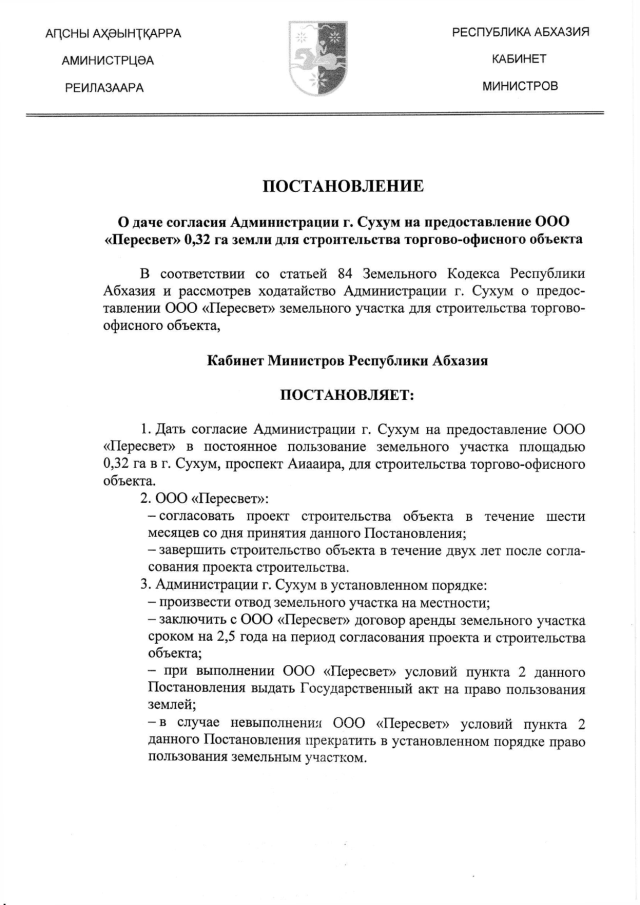 Постановление Кабинета Министров Республики Абхазия от 06.05.2016 № 84 "О даче согласия Администрации г. Сухум на предоставление ООО "Пересвет" 0,32 га земли для строительства торгово-офисного объекта"