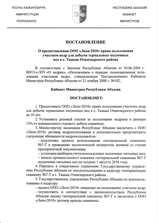 Постановление Кабинета Министров Республики Абхазия от 27.05.2016 № 96 "О предоставлении ООО "Леон-2010" права пользования участком недр для добычи термальных подземных вод в с. Тамыш Очамчырского района"