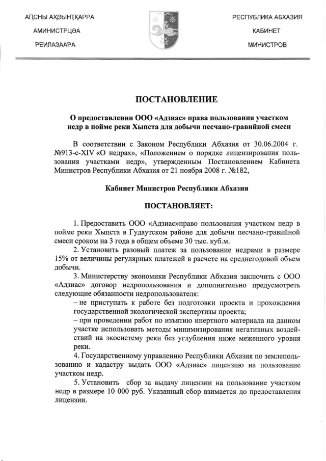 Постановление Кабинета Министров Республики Абхазия от 27.05.2016 № 97 "О предоставлении ООО "Адзиас" права пользования участком недр в пойме реки Хыпста для добычи песчано-гравийной смеси"