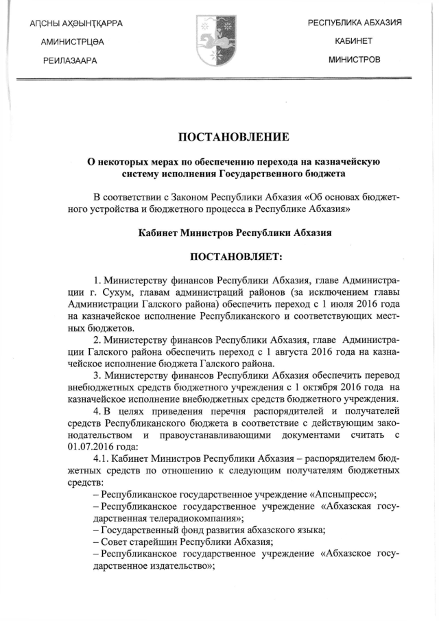 Постановление Кабинета Министров Республики Абхазия от 30.06.2016 № 116 "О некоторых мерах по обеспечению перехода на казначейскую систему исполнения Государственного бюджета"